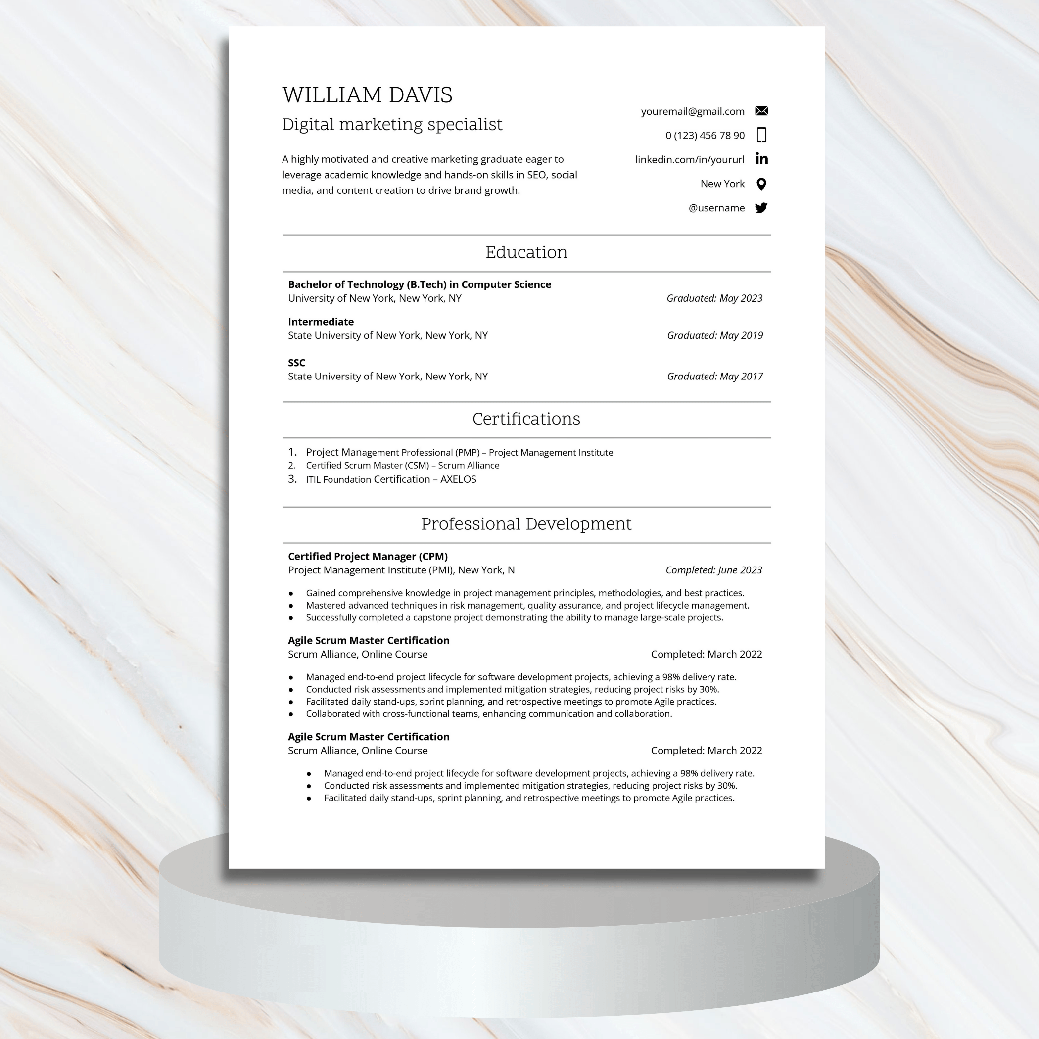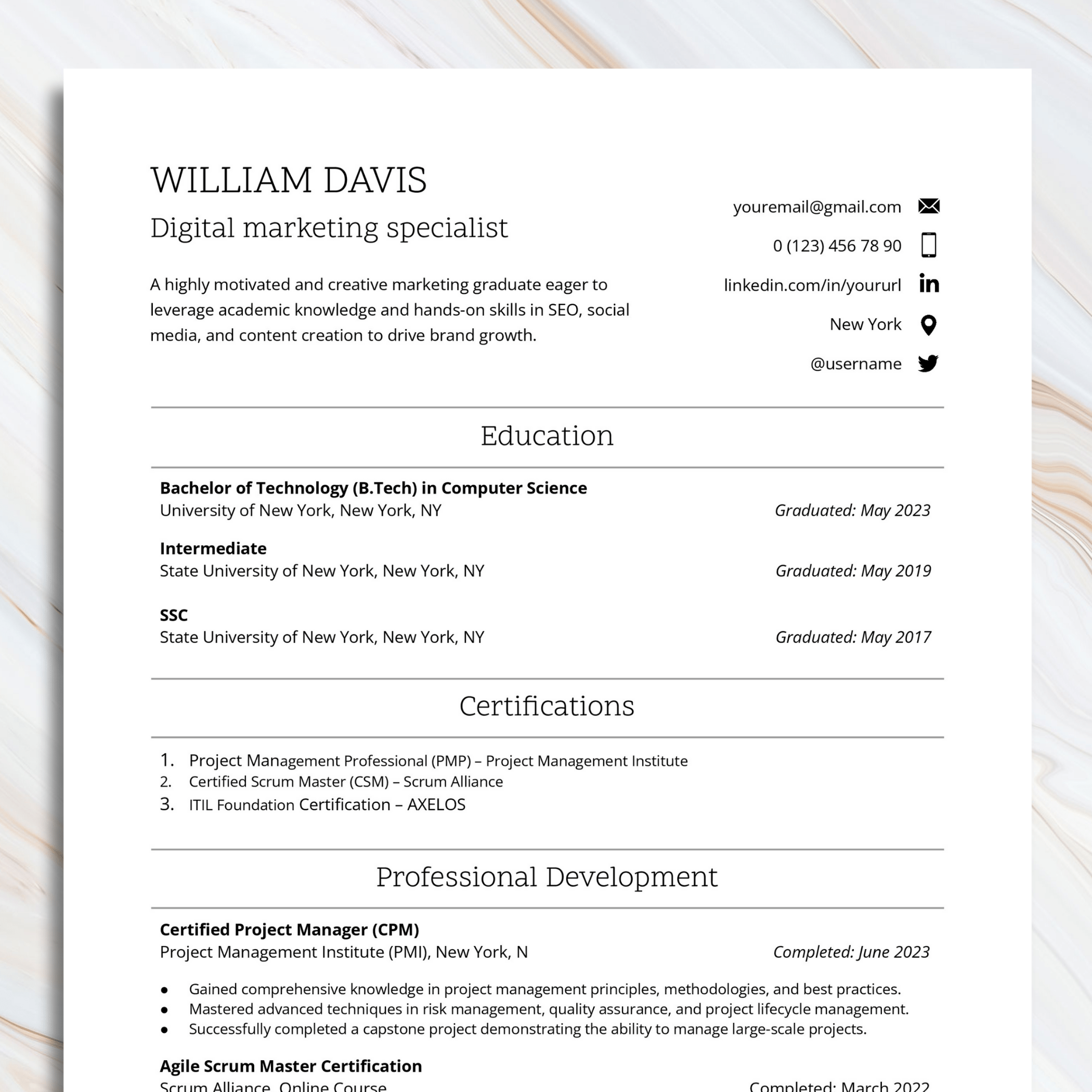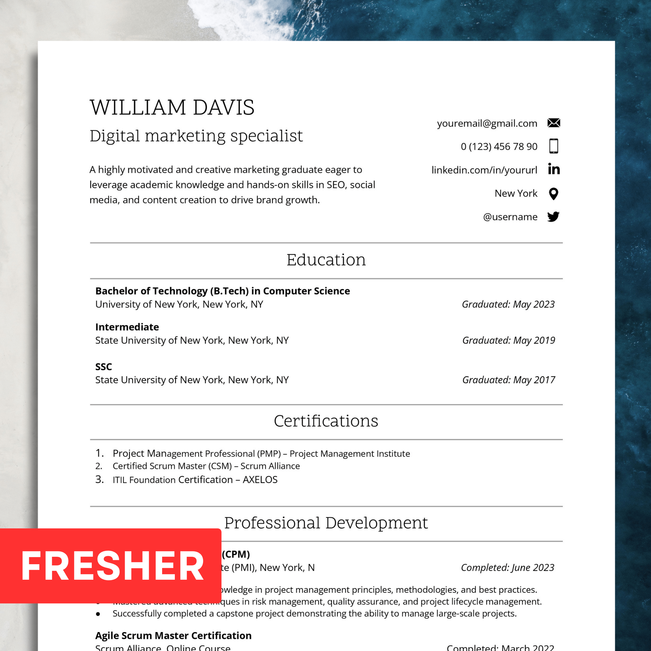 Resume for Freshers #3 – ATS Friendly – Professional Modern CV Template – Compatible for Docs, Word, Pages