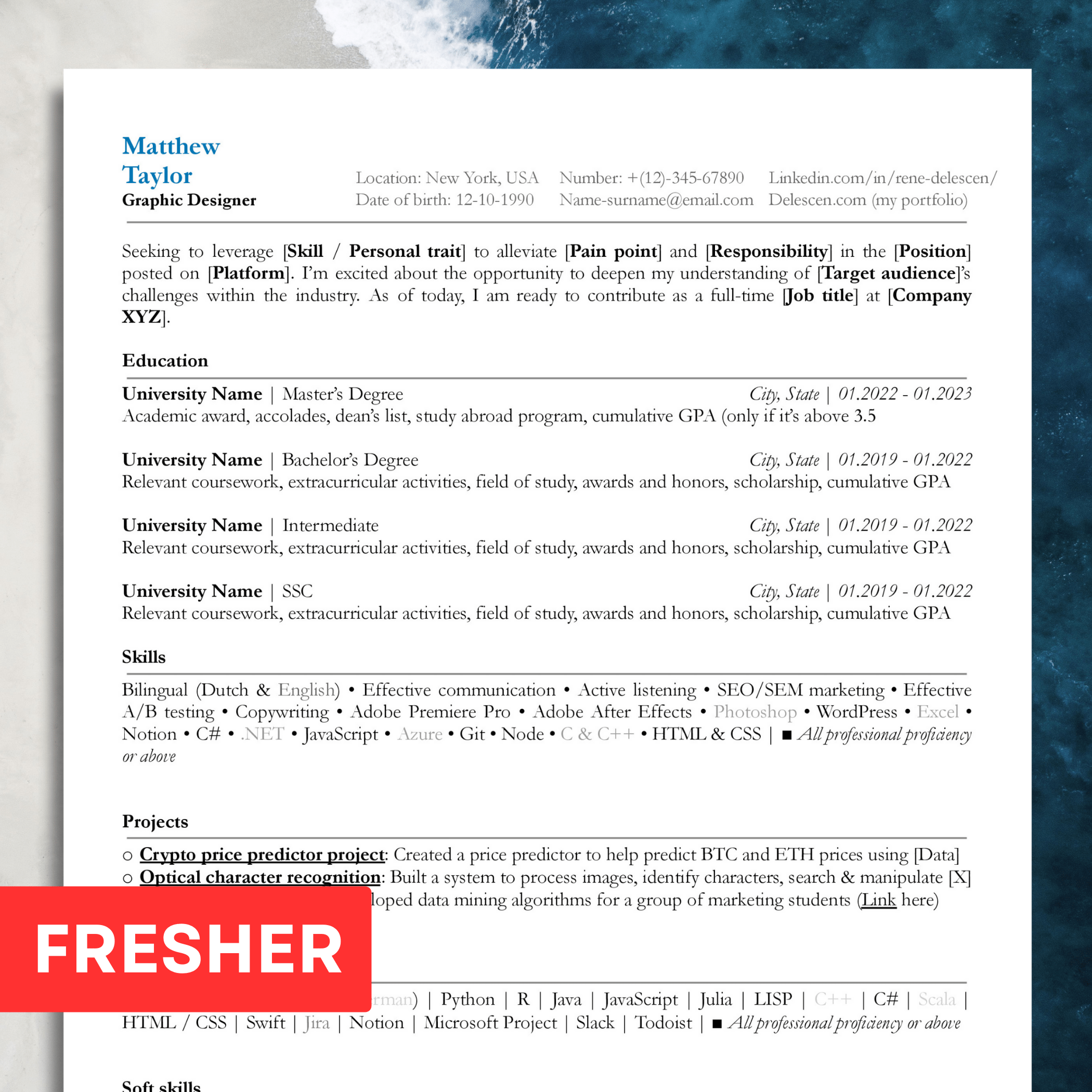 Resume for Freshers #7 – ATS Friendly – Professional Modern CV Template – Compatible for Docs, Word, Pages
